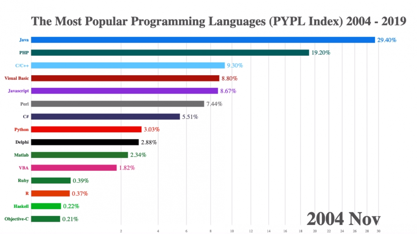 Индекс TIOBE распределил места немного по-другому: на первом месте оказался языка Java, далее следуют С, С++, С# и Python. А лидер рейтинга GitHub здесь занимает только 6-е место.