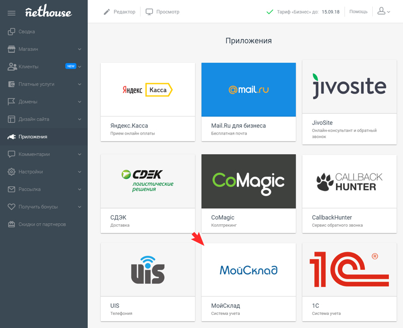 Нажимаете Создать сайт и попадаете в конструктор Nethouse с включённым тарифом «Магазин»