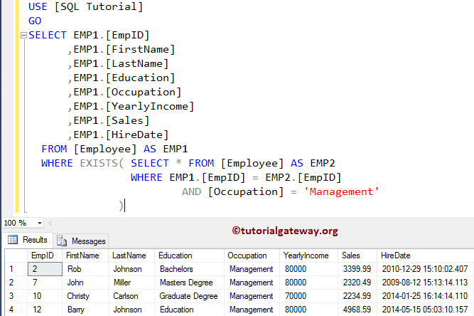 Выполнение приведенного выше SQL-запроса не вернет результатов, так как таблица employee не содержит записей firstName , содержащих Ted или Larry .