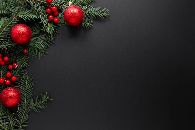 Рождественская рамка из ветвей дерева на черном фоне с копией пространства, красный и деревянный декор, ягоды, звезды , конусыПРЕМИУМ