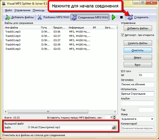 Объединение нескольких музыкальных файлов, песен, рингтонов, mp3 в один.