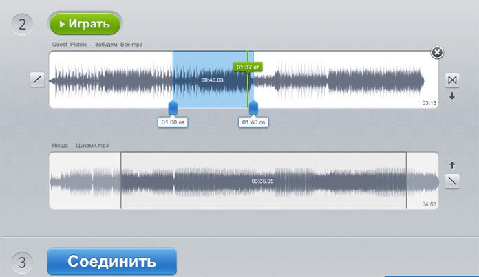 - Позволяет вырезать и микшировать несколько файлов песен онлайн вместе.