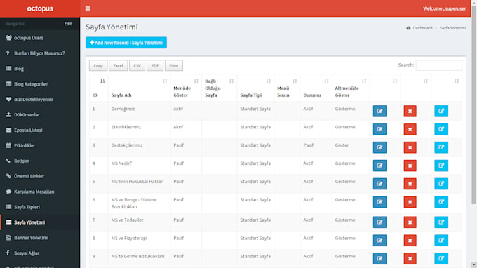 - Здесь мы можем работать с деревом сайта (пункты меню): обновлять, удалять, добавлять, скрывать и т.п.
