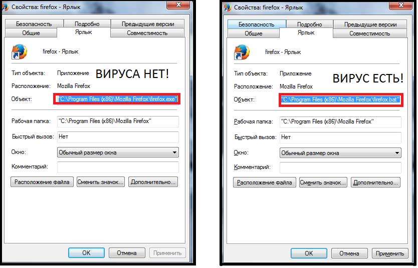 5. А теперь уже читаем читаем внимательно. Нас в этом окне интересует только одна строчка — «Объект:». Там должен быть указан только один путь. Например, в браузере Google Chrome эта строчка должна выглядеть так: