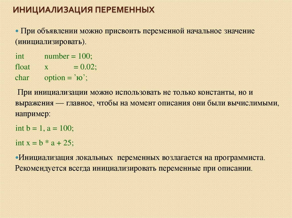 Во многих языках вместе с объявлением переменной мы можем сразу задать ей начальное значение через оператор присваивания. В программировании это называется «инициализировать».
