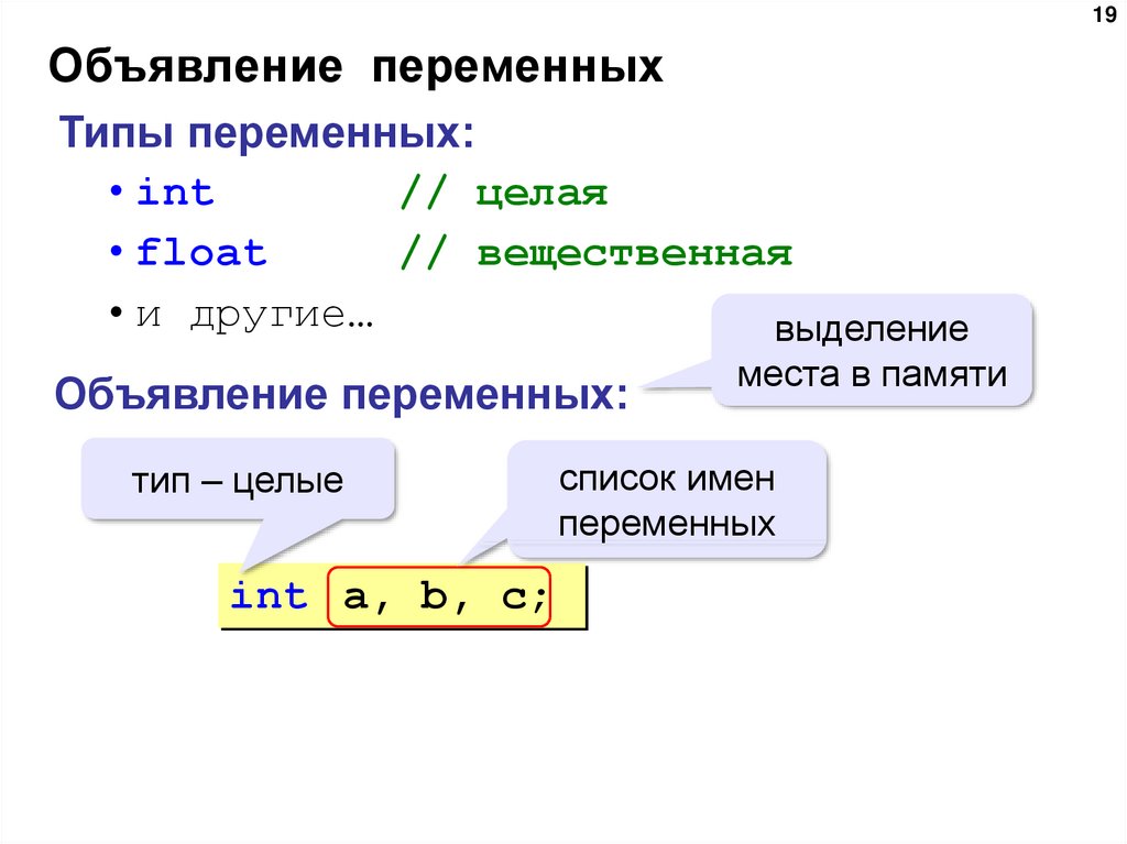 Вы должны объявить свои переменные компилятору C, прежде чем использовать их. Вы делаете это, предоставляя список переменных в начале программы. Таким образом, компилятор знает, как называются переменные и к какому типу они относятся (какие значения они могут содержать).