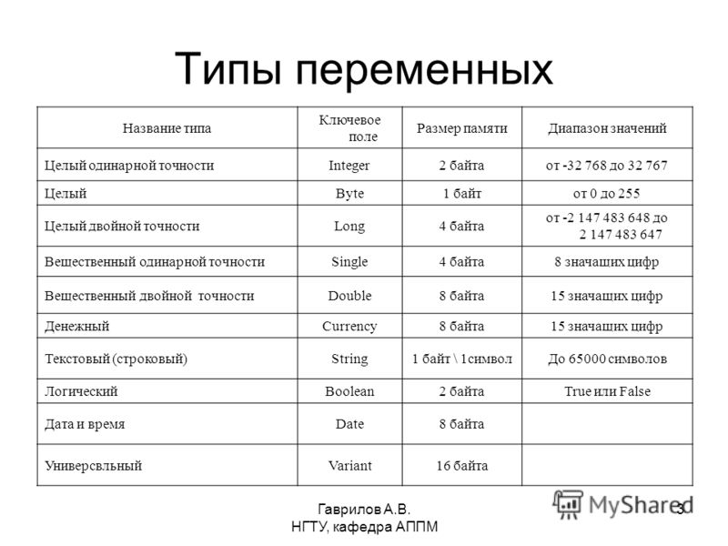 - Существует несколько различных типов числовых переменных, в зависимости от размера и точности числа.