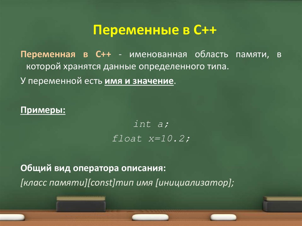 short int а = 1; // целая переменная аconst char С = 'С' ; // символьная константа Сchar s, sf = 'f' ; // инициализация относится только к sfchar t (54);float с = 0.22, x(3), sum;