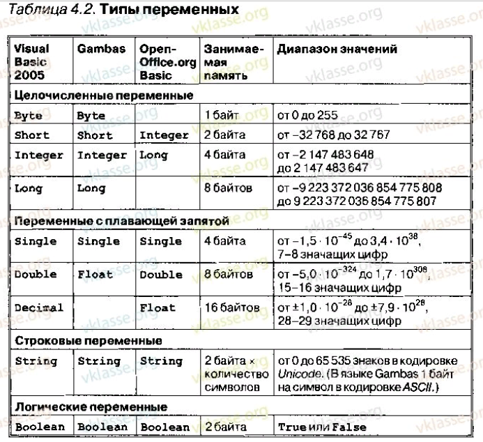 Как правило, тип переменной будет одним из типов, перечисленных в табл.