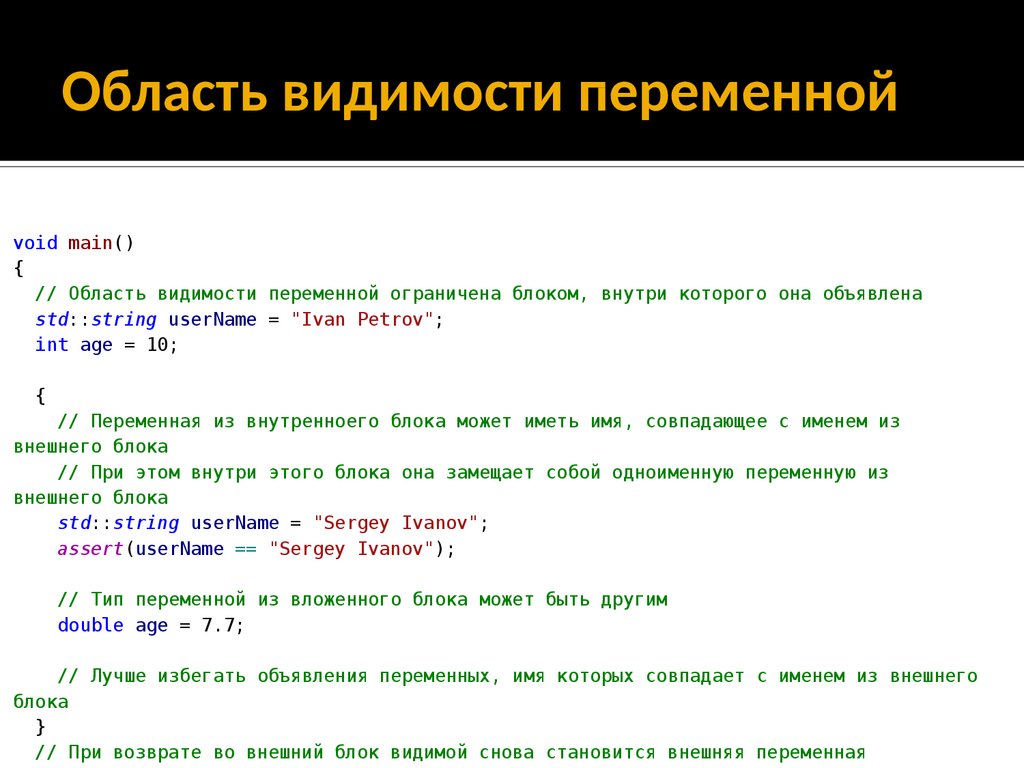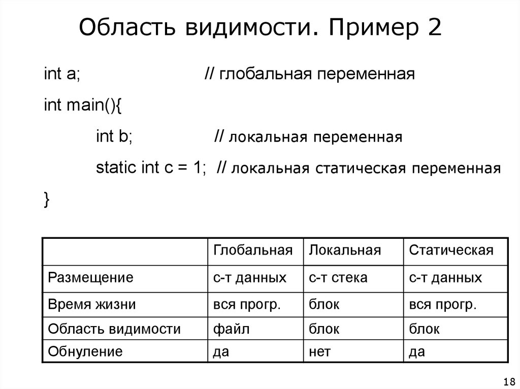 Еще одной важной особенностью области видимости переменных является статические переменные. Статическая переменная существует только в локальной области действия функции, но не теряет своего значения когда выполнение программы выходит из этой области. Рассмотрим следующее пример: