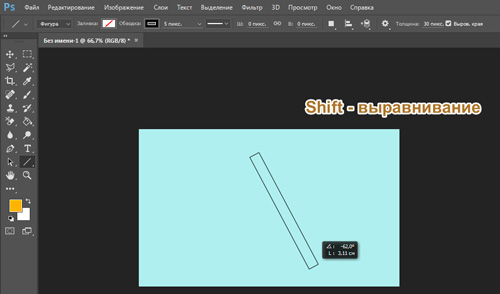 Используя сдвиг, можно рисовать прямые линии со смещением под углом 45 градусов в любую сторону рабочей области. - Рисование без рук также можно выполнять без использования клавиши Shift, что приводит к изменению пикселизации, что не рекомендуют многие профессиональные пользователи Photoshop.