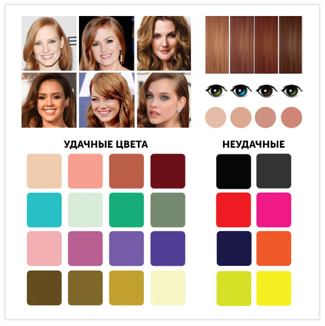Цвет волос между светло-рыжим и белокурым. Весенние типы относятся к людям, которым особенно идут сияющие и свежие тона. Теплые цвета подчеркивают золотой оттенок кожи. Из красных тонов для весеннего типа лучше всего подходят градации от оранжево-красного до кораллового и светлый ржаво-красный. Прекрасно подойдут оранжевые тона и оттенки персика, лосося и абрикосовый. Теплые природные тона, белизна шерсти, бежевый и верблюжий. Подойдут все оттенки зеленого. От яркого до нежного. Например, яблочная зелень и желто-зеленый. Теплый солнечный желтый цвет прекрасно гармонирует с весенней палитрой.