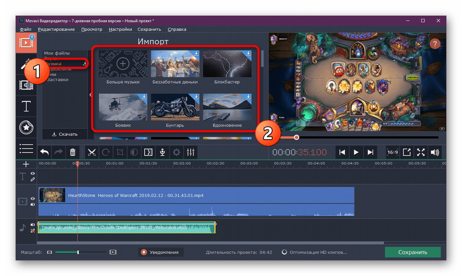 Выберите подходящую мелодию из списка и наложите её на видео в один клик
