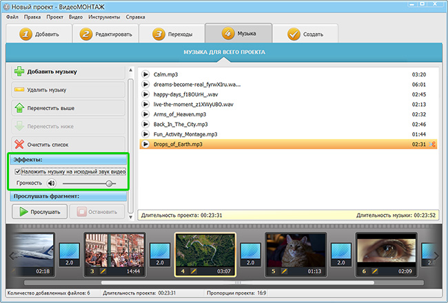 Программа позволяет совмещать музыкальный фон с исходным звуком в видео