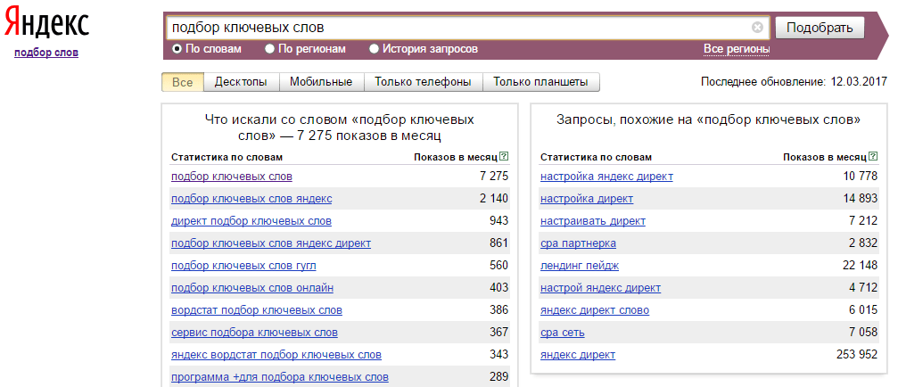 Также отчет включает полный список ключевых слов, используемых в обычном поиске и рекламе:
