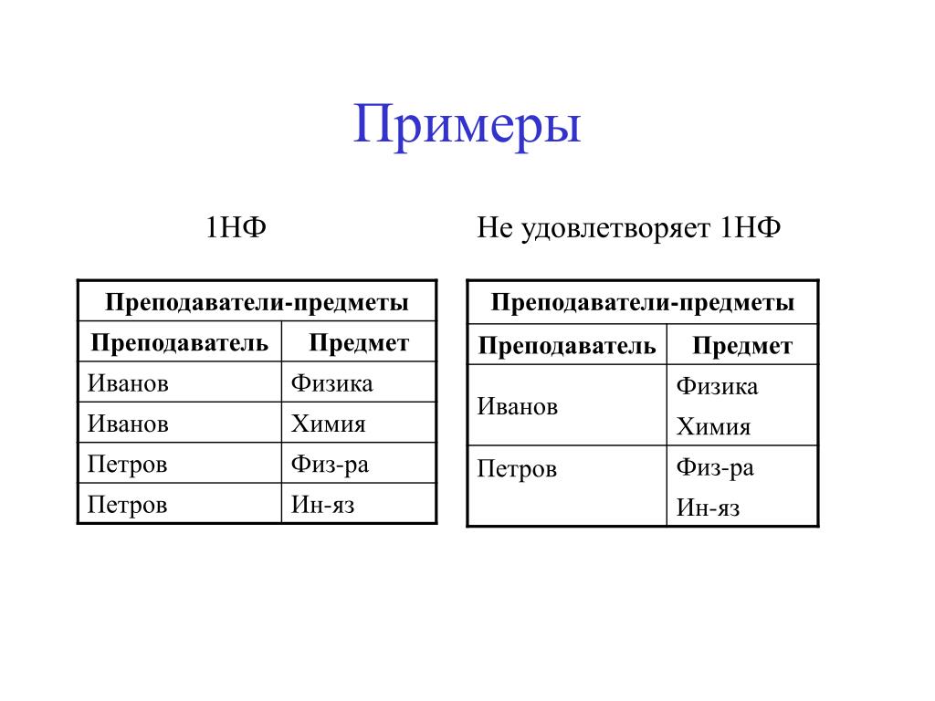 Примером двоичного отношения 1: N может быть соотношение между учителем , преподающим предмет . В конкретном классе учителя могут преподавать более одного предмета разным ученикам, но все предметы имеют одинаковые отношения с учителем.