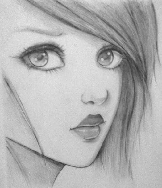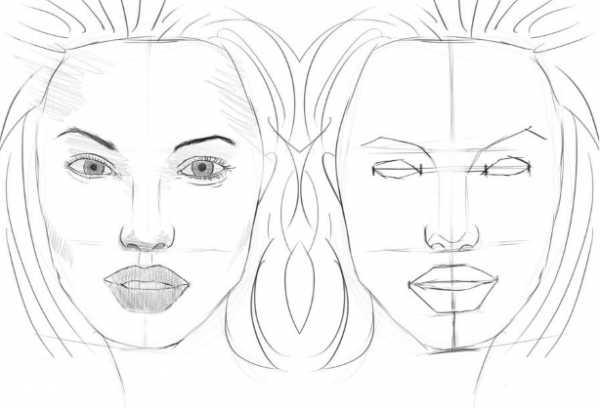 Первая разделяет лицо слегка пониже половины, вторая другую часть. Чтоб Вы понимали, смысл данных линий показать приблизительное нахождение носа – вертикальная линия, глаз, губ – это горизонтальные. Но сильно давить на карандаш нельзя, контур будет стёрт, как только достигните пропорциональности лица. Легкими движениями, начертите части носа, ниже губ. Затем самое важное в портрете, это элемент зарисовки зеркала души. Их расположение находится слегка повыше переносицы, его внешние края указывают, где будут идти внутренние уголки. Есть один факт, возможно, который не все знают, что расстояние между глазами, равно размеру одного глаза. Рассмотрите, какая форма у портретируемой и старайтесь приблизиться к ней. Рисовать брови стоит начинать с внутренней стороны, точки, что ближе к носу. И соответственно, не забудьте про ресницы. Чтобы сделать ровный рот, проведите вспомогательный конусообразный контур от внешних уголков глаз к области предполагаемых губ.