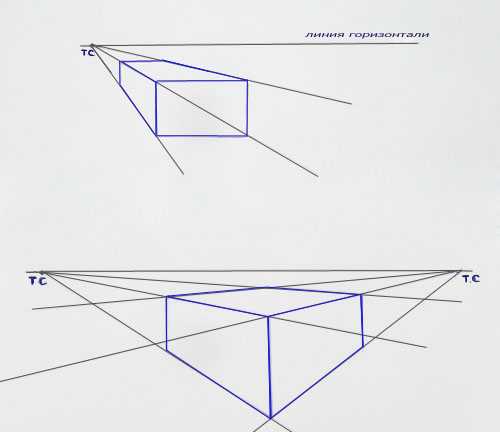 Чтобы выстроить перспективу, на листе Вам необходимо обозначить линию горизонта (линию уровня глаз). Отталкиваясь от расположенности линии горизонта, вы и начнете выстраивать необходимый Вам объект. Точки, от которых проводятся линии, окажут Вам помощь в построении. Их называют — т.с. (точками схода). В нижеприведенном рисунке, мы показываем пример построения куба, пользуясь одной и двумя точками схода.