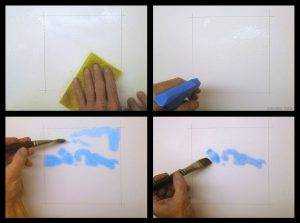 Используя эту методику, вначале прорисовывают фон, а затем – объекты первого плана. Легкими непринужденными движениями сначала рисуем облака голубой краской. Старайтесь распылять штрихи – это создаст эффектную картинку.