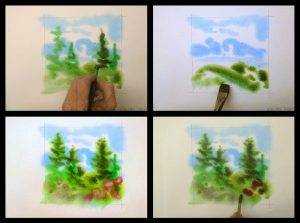 Данный метод подойдет для новичков, которые хотят овладеть навыками рисования красками и кистью. А рисовать мы будем небольшой пейзаж. Нам понадобится распылитель с водой, губка, лист бумаги, акварель и кисть.
