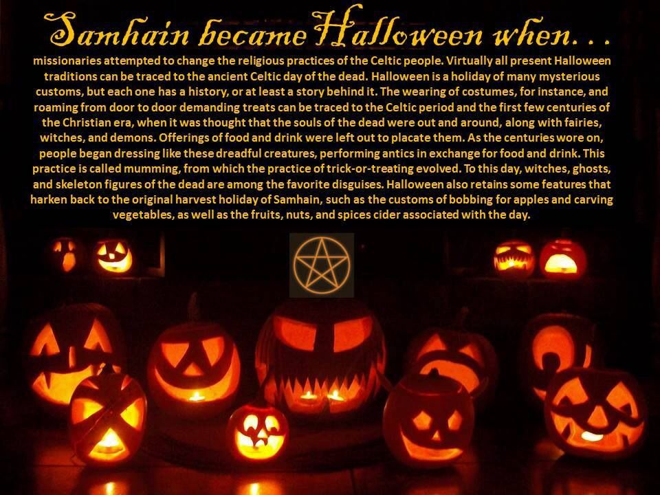 Традиции Хэллоуина произошли от традиций древнего кельтского праздника Самайн. Кельты праздновали в ночь на 31 октября, потому что верили, что мертвые возвращаются на землю в эту ночь. В священную ночь Самайн люди собирали урожай, а затем праздновали, собираясь, чтобы зажечь костры, приносить жертвы и отдавать дань уважения мертвым. Празднование мертвых постепенно менялось с годами. Поскольку некоторые традиции Самайна, в том числе большие костры, принесенные в жертву животные и столы, полные готовой еды, оставленной в качестве подношений умершим, прекратились, некоторые традиции остаются, например, традиции Старого Света переодевания или переодевания в костюм маскировки.