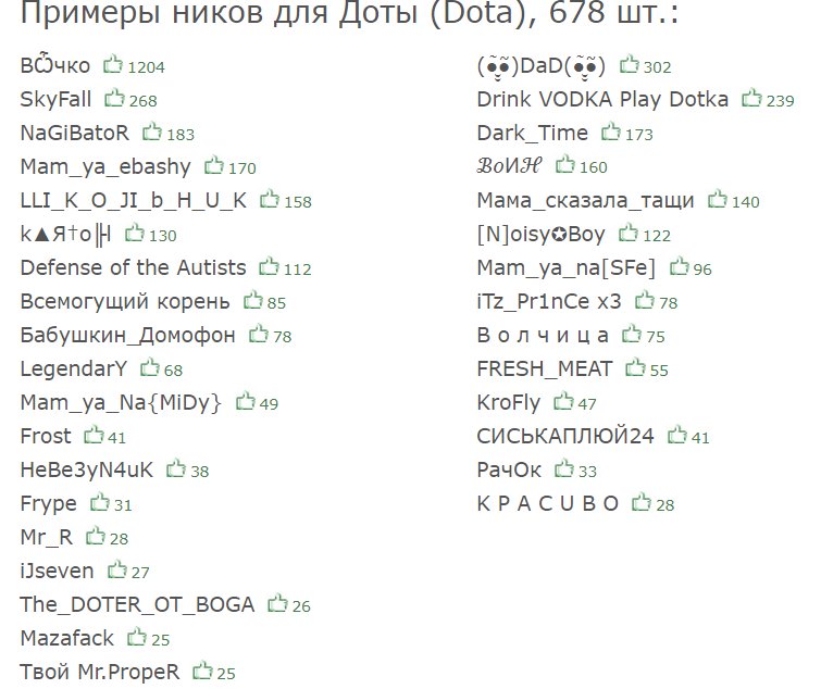 Таким образом мы сможем составить рейтинг самых лучших ников на русском языке.