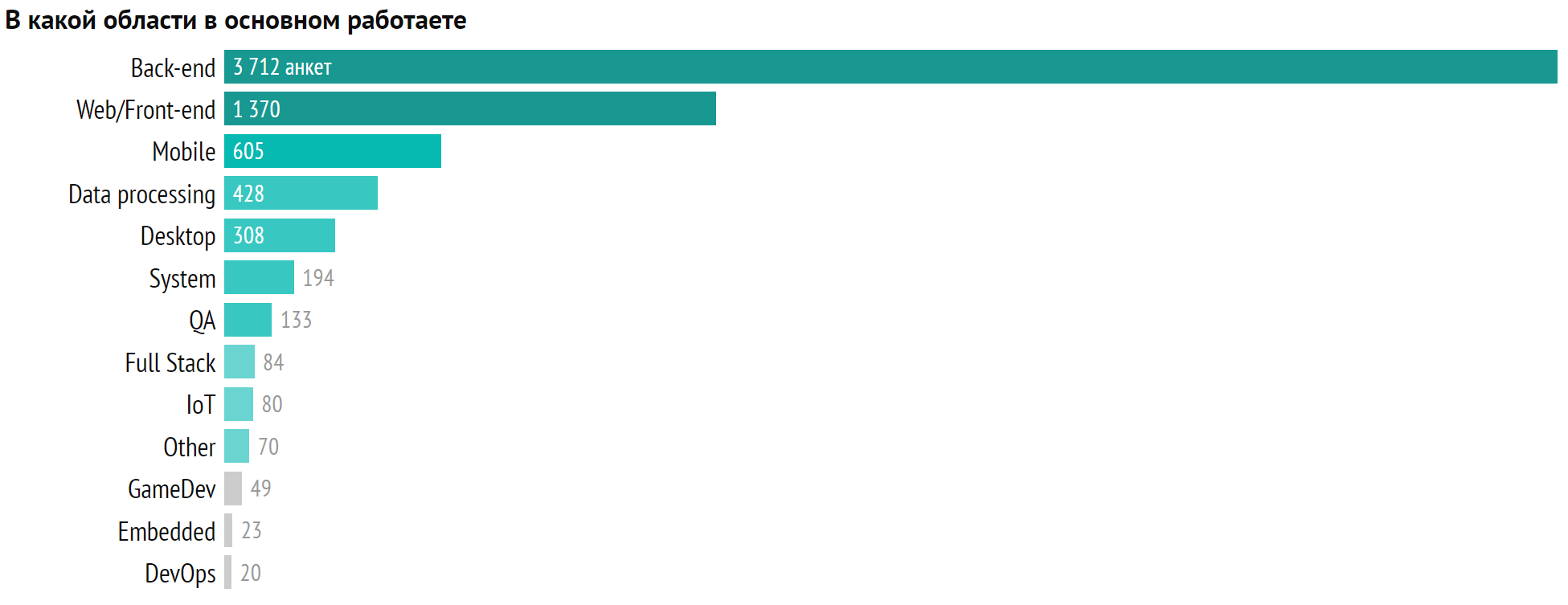 Если смотреть по отрасли применения, то ситуация другая: в бэкенд-программировании Java все еще доминирует, C# на третьем месте после PHP, а доля TypeScript и JavaScript не так уж велика, C# — также является популярным языком в геймдеве.
