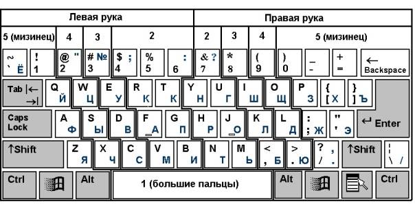 ΠΠ΅ΡΠ΅Π΄ ΡΠ΅ΠΌ, ΠΊΠ°ΠΊ Π½Π°ΡΠ°ΡΡ ΠΏΠ΅ΡΠ°ΡΠ°ΡΡ ΡΠ΅ΠΊΡΡ, Π½Π°Π΄ΠΎ ΠΎΡΡΡΠΊΠ°ΡΡ ΠΎΠΏΠΎΡΠ½ΡΠΉ ΡΡΠ΄ Π½Π° ΠΊΠ»Π°Π²ΠΈΠ°ΡΡΡΠ΅. ΠΡΠΎ ΡΡΠ΅ΡΠΈΠΉ ΡΡΠ΄ ΠΊΠ»Π°Π²ΠΈΡ ΡΠ½ΠΈΠ·Ρ (Π½Π΅Π·Π°Π²ΠΈΡΠΈΠΌΠΎ ΠΎΡ ΡΠ°ΡΠΊΠ»Π°Π΄ΠΊΠΈ). Π£ΠΊΠ°Π·Π°ΡΠ΅Π»ΡΠ½ΡΠΉ ΠΏΠ°Π»Π΅Ρ Π»Π΅Π²ΠΎΠΉ ΡΡΠΊΠΈ ΡΠ°Π·ΠΌΠ΅ΡΠ°Π΅ΡΡΡ Π½Π° ΡΡΡΡΠΊΠΎΠΉ Π±ΡΠΊΠ²Π΅ Π, Π° ΡΠΊΠ°Π·Π°ΡΠ΅Π»ΡΠ½ΡΠΉ ΠΏΠ°Π»Π΅Ρ ΠΏΡΠ°Π²ΠΎΠΉ ΡΡΠΊΠΈ β Π½Π° Π±ΡΠΊΠ²Π΅ Π. ΠΎΡΡΠ°Π»ΡΠ½ΡΠ΅ ΠΏΠ°Π»ΡΡΡ ΡΠ°ΡΠΏΠΎΠ»Π°Π³Π°ΡΡΡΡ Π½Π°Π΄ ΡΠΎΡΠ΅Π΄Π½ΠΈΠΌΠΈ ΠΊΠ»Π°Π²ΠΈΡΠ°ΠΌΠΈ.