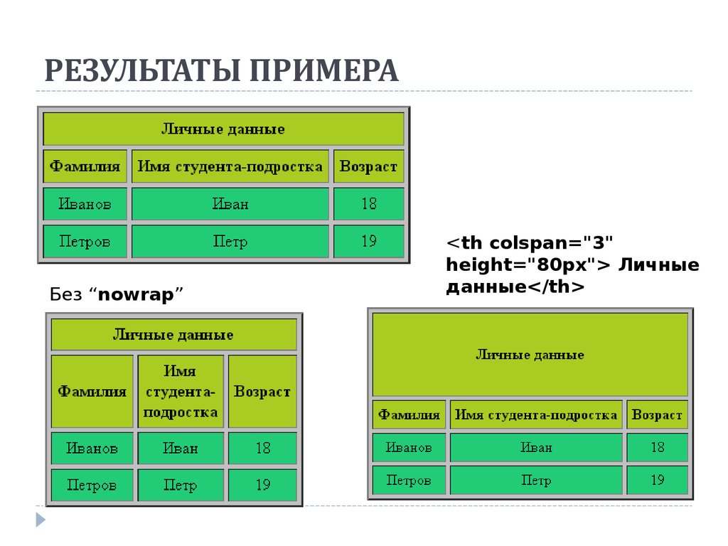 Создание таблиц Таблицы HTML создаются в четыре этапа.На первом этапе в HTML-коде с помощью парного тега <TABLE> формируют саму таблицу:<TABLE></TABLE>Таблица HTML представляет собой блочный элемент Web-страницы. Это значит, что она размещается отдельно от всех остальных блочных