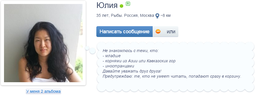 «Всем привет. Ищу девушку, без бурного прошлого, детей и не стесненную в жил. площади. Знаю, таких может и не быть на этом сайте вообще, но по анкетам ходит много незарегистрированных посетителей сайта. Желательно из полной семьи. Ищу не успевшую заразиться потребительством Запада, которая понимает, что iPhone это не драгоценность и не имидж, а лишь очередное средство для общения. Без вредных привычек, такую, которая скорее принимает главные черты патриархального взгляда на жизнь, но с элементами матриархата, ибо я не деспот. Повторяю. Девушки, будьте проще, пожалуйста! Спуститесь с небес! Не будьте пассивны в общении. Тот старый подход, что уже с рождения заложен в нас, по типу «Раз мужик, то должен все по умолчанию»! Например, хорошую квартиру, отдельную от родителей или близких.