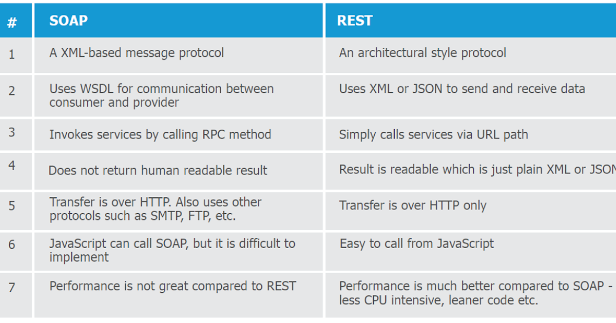 • REST обычно использует JSON, который легче анализировать и обрабатывать. В дополнение к этому, REST не требует наличия определения службы для предоставления веб-службы.