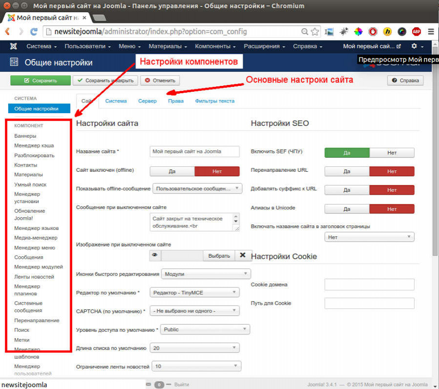 После установки Joomla, настройки резервного копирования, а так же знакомства с восстановлением сайта, займёмся общими настройками.