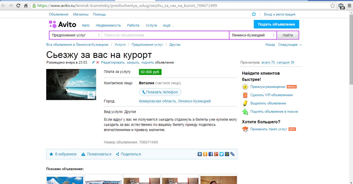 • Размещайте объявления и зарабатывайте. На Авито товары находят покупателей, а мастера своего дела — постоянных клиентов. Опубликуйте объявление, чтобы его увидел нужный человек.