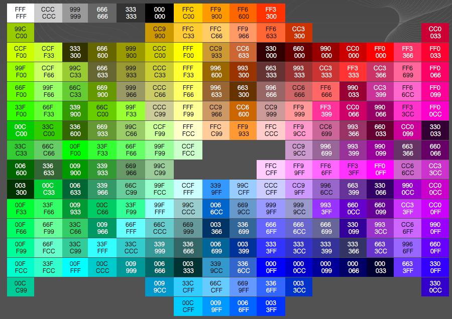 | Yellow | #FFFF00 | 255, 255, 0 |