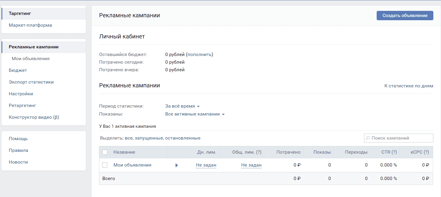 Основная статистика по всем рекламным кампаниям отражается на главной странице рекламного кабинета.