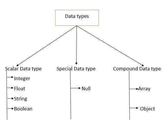 Для различных целей существуют различные типы данных, например. null, двоичное, целое число, число с плавающей запятой, строка, объект, свойство и массив.