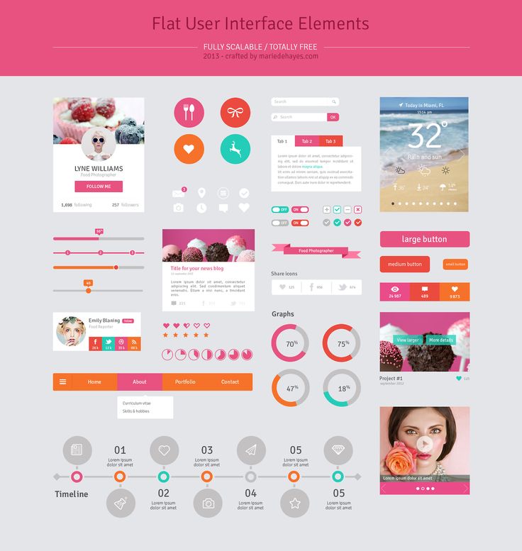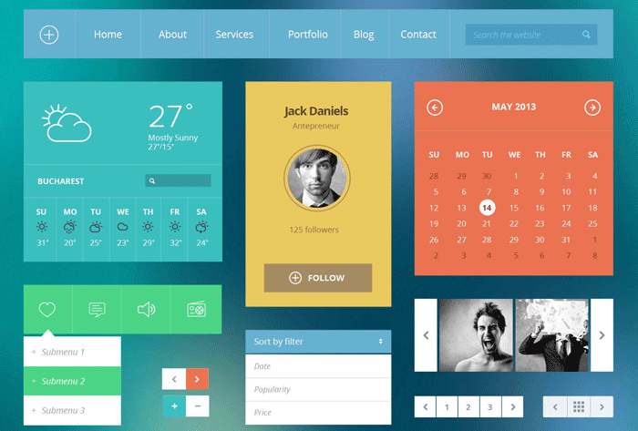 Простой и понятный бесплатный набор пользовательского интерфейса в стиле виджетов, состоящий из 25 готовых компонентов для начала работы над дизайном веб-сайта.