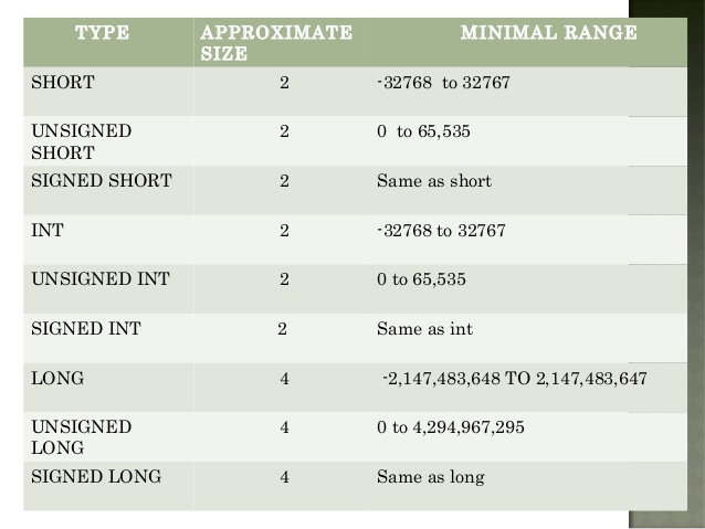 short | 2 | short int, signed short int | От -32 768 до 32 767 |