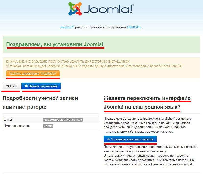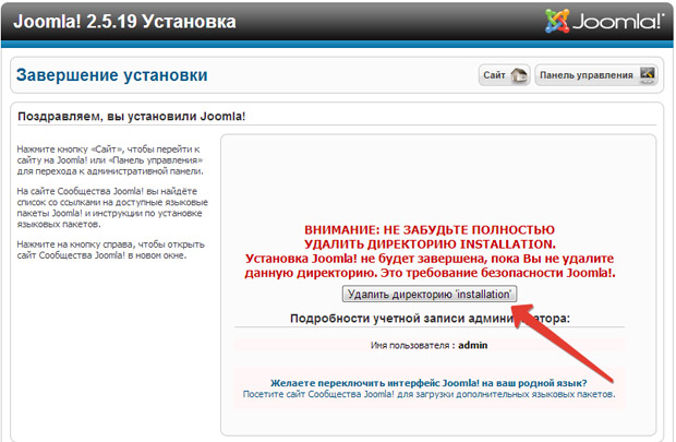 Теперь вы можете удалить папку установки. Щелкните папку Удалить папку установки , и появится сообщение об успешном выполнении. Теперь вы можете перейти к входу администратора, нажав Администратор , или перейти прямо на свой сайт, нажав Сайт .