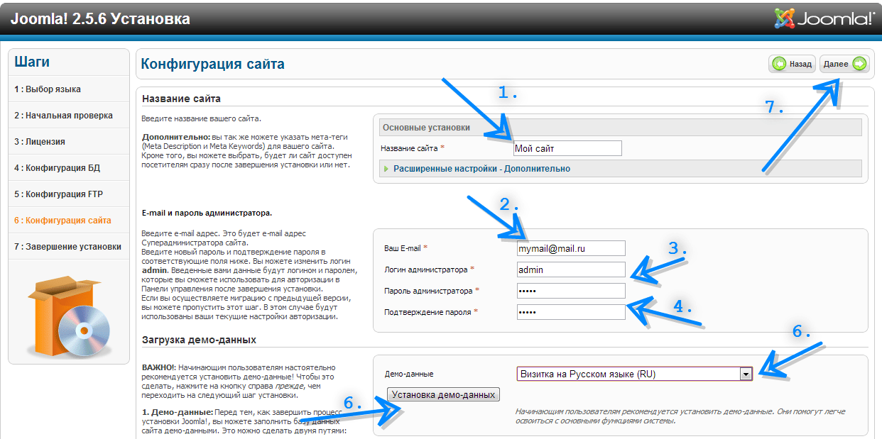 - Имя пользователя и пароль администратора: Joomla использует по умолчанию «admin» в качестве имени пользователя для суперпользователя. Можно оставить как есть, а можно изменить. Установите пароль.