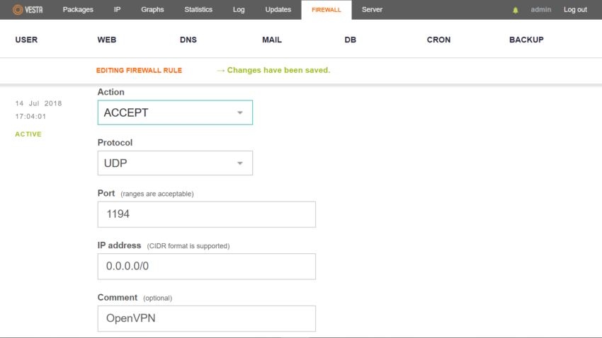 Затем в конце раздела сохраните ваши настройки. Теперь хостинг панель Vestacp, полностью функциональна и готова к дальнейшей работе.