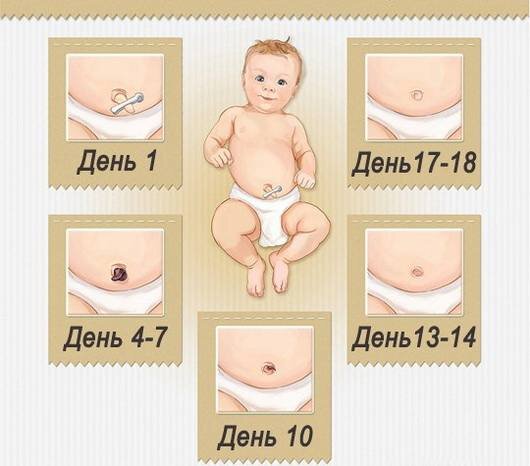 На месте отрезанной пуповины остается культя длиной 1-2 см. Она высыхает и отпадает в течение 1-2 недель после рождения. На ее месте формируется пупочная ямка — собственно пупок ребенка.