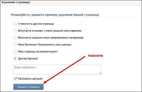 Если ты нажмешь на галочку Рассказать друзьям, ты уберешь ее, и твои друзья даже не узнают сразу, что твоя страница удалена.