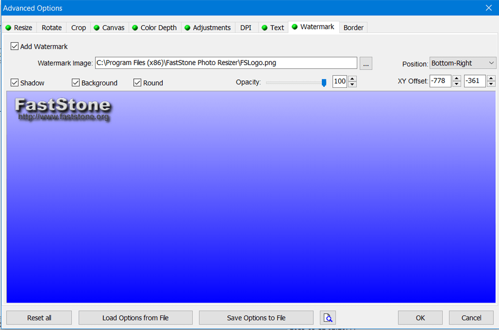 Несмотря на то, что количество опций, предоставляемых Arclab Watermark Studio, несколько занижено, программа все же предлагает все необходимые инструменты для настройки водяного знака. Вы можете выбрать шрифт, размер текста или настроить непрозрачность каждого водяного знака, созданного с помощью Arclab Watermark Studio, и даже использовать логотипы в качестве водяных знаков. Также доступна возможность добавления нескольких водяных знаков на одно изображение, а также функция пакетной обработки, позволяющая накладывать один и тот же водяной знак на неограниченное количество изображений. Arclab Watermark Studio оснащена инструментами изменения размера изображения, что делает ее идеальным выбором для фотографов, которые часто публикуют свои работы в социальных сетях.