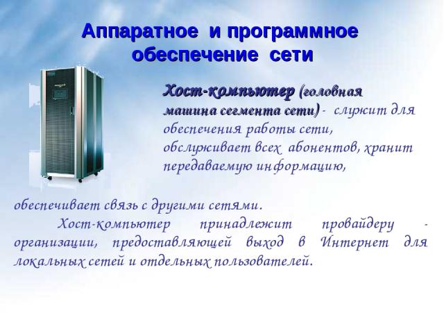 ПК, на котором можно осуществлять основную обработку всех данных называется хост-компьютер и он также является централизованной рабочей станции, сервером или универсальным вычислительным устройством которое находится в пределах сетевой среды, которая управляет заданиями, общается с помощью инструкций, или предоставляет определенные услуги другим компьютерам в сети известными как клиенты.