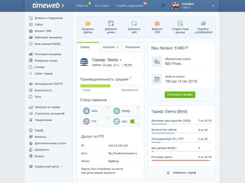 На первом экране размещены основные показатели по сайтам, об аккаунте и сервере. Вы легко сможете:
