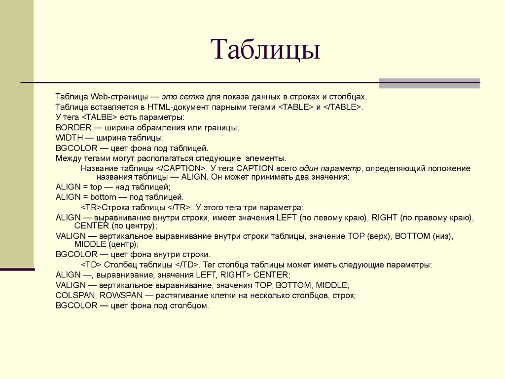 - Создание HTML-таблиц: ряды, столбцы, ячейки.