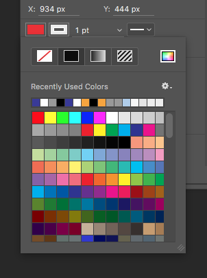 Инструменты Paint Bucket/Заливка и Gradient/Градиент на панели инструментов занимают одну ячейку, отображается же всегда пиктограмма последнего выбранного инструмента. Для того чтобы выбрать другой инструмент, необходимо нажать правой кнопкой мыши на стрелке рядом с данной пиктограммой и выбрать нужный инструмент из всплывающего меню. Так же всплывающее меню может быть вызвано на экран, если нажать на пиктограмму и удерживать ее нажатой некоторое время.