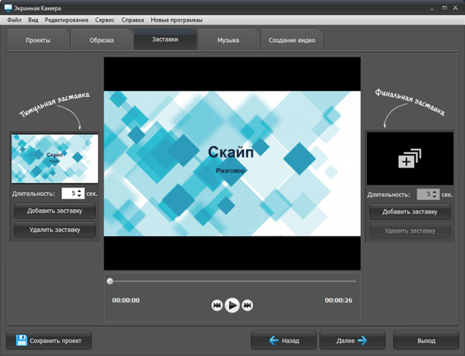 Перед началом записи необходимо выделить нужную область экрана. Затем нажать кнопку «запись». Видео сохраняется в нужном вам качестве. Можно, не выходя из программы, записать видео на DVD или выложить в «ЮТуб». Раздел «Создание видео» поможет сделать это быстро и без лишней мороки. Немаловажным плюсом является функция редактирования. Данная опция позволяет обрезать видео, добавлять титры и заставки, накладывать аудиофайлы.