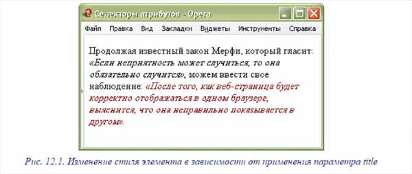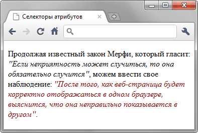 <!DOCTYPE html> <html> <head> <meta charset="utf-8"> <title>Селекторы атрибутов</title> <style> q { font-style: italic; /* Курсивное начертание */ quotes: "\00AB" "\00BB"; /* Меняем вид кавычек в цитате */ } q[title] { color: maroon; /* Цвет текста */ } </style> </head> <body> <p>Продолжая известный закон Мерфи, который гласит: <q>Если неприятность может случиться, то она обязательно случится</q>, можем ввести свое наблюдение: <q title="Из законов Фергюссона-Мержевича">После того, как веб-страница будет корректно отображаться в одном браузере, выяснится, что она неправильно показывается в другом</q>.</p> </body> </html>